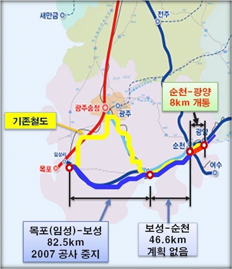 목포~보성 간 고속화 사업은 동서통합, 남해안 권역 동반성장을 이루는 중심축임에도 2007년 4월 중단돼 진척이 없는 상태이기 때문에 내년도 재착공을 위한 공사비 500억 원을 정부예산에 반영해 줄 것을 요청했다.