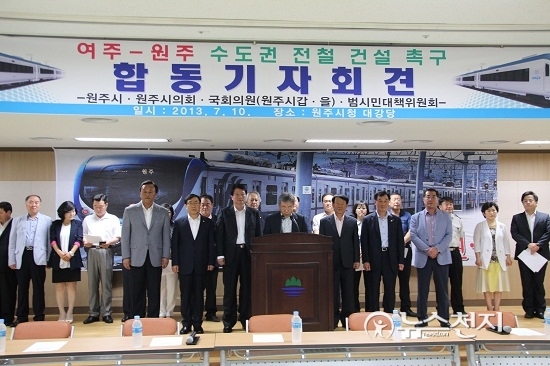 [천지일보 원주=이현복 기자] 강원 원주시(시장 원창묵)는 10일 원주시청에서 여주-원주 수도권전철 건설을 촉구하는 합동기자회견을 열었다.