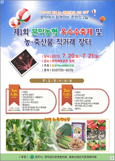 [천지일보 원주=이현복 기자] 강원 원주시가 후원하고 문막농협이 개최하는 제1회 문막농협 옥수수축제 및 농축산물 직거래장터가 오는 20일부터 21일까지 2일간 문막체육공원 일원에서 열린다.