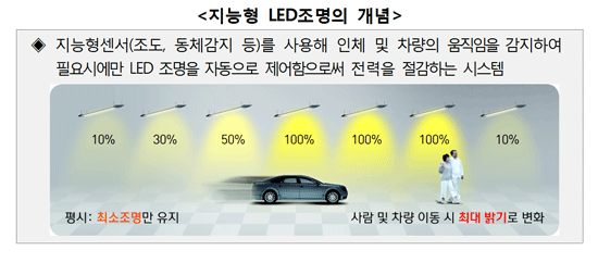 지능형 LED조명이란 24시간 조명이 필요한 지하주차장에 평소에는 최소한의 밝기만 유지하다가 사람이나 차량의 움직임이 있는 경우에만 환하게 밝힘으로써 입주민들의 불편은 전혀 없는 반면 전력사용량은 현저하게 절약할 수 있는 첨단기술이다.