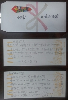 편지에는 흑두루미 서식지 보호를 위해 전신주를 뽑는 등 환경보호에 적극적인 순천시를 보고 크게 감동 받아 기부하고 싶다는 내용과 함께 일십만 엔(한화 112만 원)이 들어있었다.