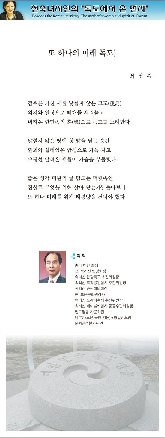 관련기사 [아침평론] ‘모르면 당하는 정치의 모든 것’에 관심 가져야 [독도시] 역사를 왜곡한 죄 - 김석쇠 [독도시] 독도 아리랑 - 천기화 [독도시] 독도 - 김기수 [독도시] 임의 품 - 김준성 [독도시] 독도 - 최완석 [독도시] 독도에게 보내는 편지 - 김소해 [독도시] 소나무를 다시 품어라 - 김순영 [독도시] 한반도 사랑 섬 - 박종래 [독도시] 독도 - 이혜경 [독도시] 새말 휴게소에 독도가 있었다 - 장분선
