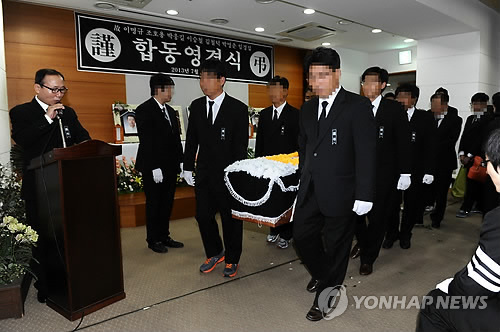 21일 오전 10시 서울 고려대 구로병원에서 노량진 희생자들의 합동영결식이 가족장으로 열렸다. 김철덕(52), 임경섭(44) 이명규(60) 박명춘(48), 이승철(54), 박웅길(55), 조호용(60) 씨 등 희생자 7명이다.
