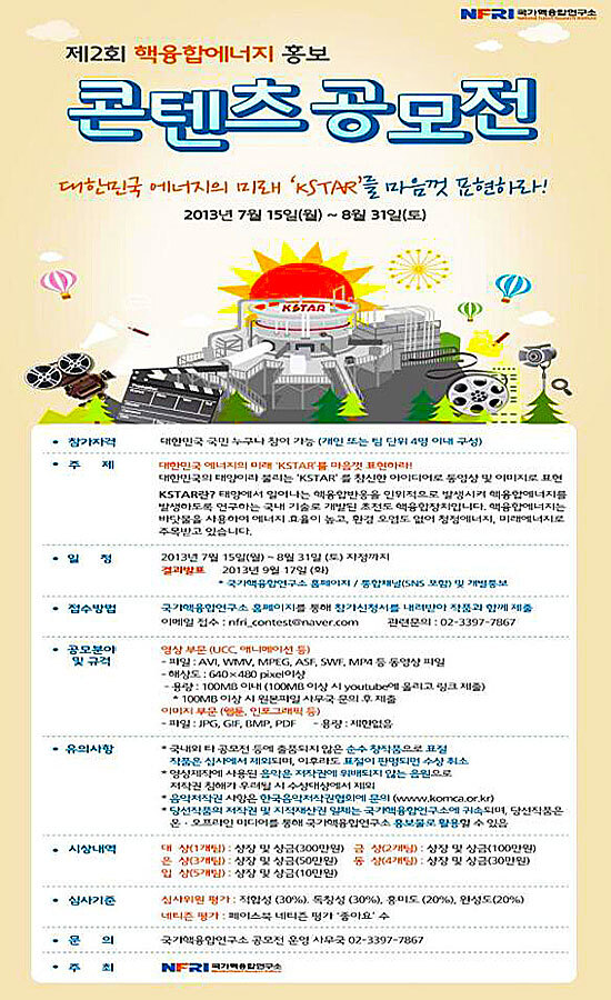 미래창조과학부(장관 최문기)와 국가핵융합연구소(소장 권면)가 주최한 ‘핵융합 에너지 홍보 콘텐츠 공모전’은 미래 에너지원인 핵융합에너지의 이해를 높이고, 국내 기술로 개발된 KSTAR을 국민들에게 알리기 위해 열렸다.