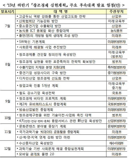 구체적으로 하반기 64개 후속대책 및 사업계획을 차례로 발표할 예정이다. 7월 발표된 ‘고급두뇌 역량 강화를 통한 산업고도화 전략’을 시작으로 ‘농식품 ICT 융복합 확산 종합대책’ ‘SW혁신 기본계획(8월)’, ‘창조경제를 견인할 창의인재 육성방안(8월)’ 등이 주요대책으로 선정됐다.