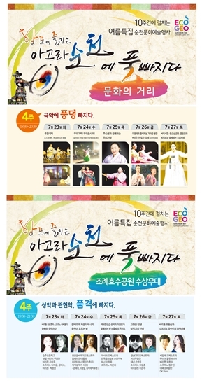 [천지일보=김미정 기자] 순천시와 문화예술행사 추진위원회(위원장 이승정)가 펼치는 아고라순천공연이 ‘뜨거운 여름, 아고라 순천에 푹 빠지다’라는 테마로 펼쳐진다.