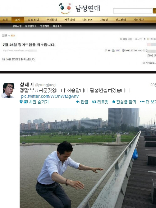 26일 성 대표의 트위터에는 “정말 부끄러운 짓입니다. 죄송합니다. 평생 반성하겠습니다”라는 글과 함께 한강 투신 인증샷이 올라왔다.