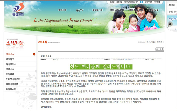 왕성교회는 최근 교회 홈페이지에 ‘성도 여러분께 알려드립니다’라는 제목의 공고문을 띄웠다. 당회는 공고문에서 “교회의 일치와 연합을 깨뜨리려는 위해(危害, 위험과 재해)행위에 대해 단호히 대처하기로 결의했다”고 밝혀 세습비판 및 재정 공개를 요구하는 교인들을 압박했다.