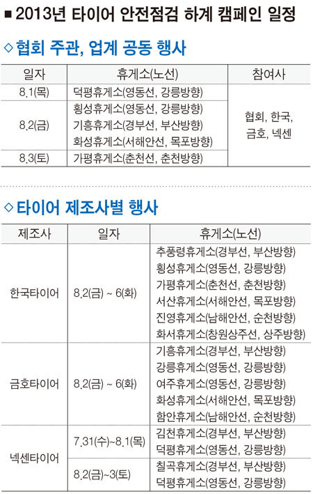 대한타이어어공업협회(타이어협회)는 국내 타이어업계(한국타이어, 금호타이어, 넥센타이어)와 함께 31일부터 8월 6일까지 일주일간 산업통상자원부 후원과 한국도로공사 협조로 타이어 무상 안전점검을 실시한다고 밝혔다.