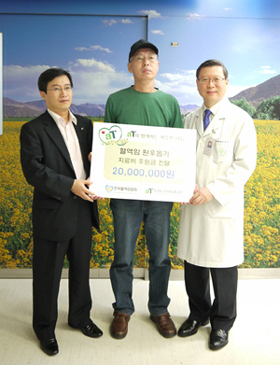 aT는 지난 29일 서울 건국대학교병원에서 농어촌지역 백혈병 및 혈액암 환우를 돕기 위한 후원금 전달식을 갖고, 한국혈액암협회에 2000만 원을 전달했다.