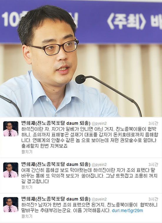 변희재 대표는 31일 자신의 트위터를 통해 “하석진? 남자가 한 번 조의 표했으면 된거지. 친노종북이들이 협박하니 말바꾸는 추태”라고 지적했다.
