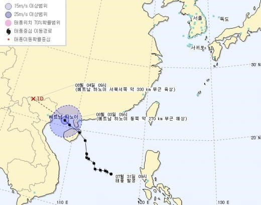 태풍 제비는 4일 오전 9시경 베트남 하노이 서북서쪽 330km 부근 육상으로 진출할 것으로 보인다고 기상청이 전했다.