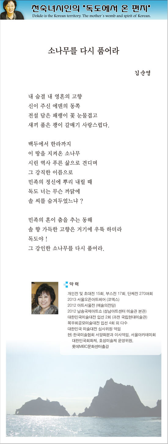 관련기사 [독도시] 새말 휴게소에 독도가 있었다 - 장분선 [독도시] 내 아들 독도야 - 이영하 [독도시] 독도에게 보내는 편지 - 김소해 [독도시] 또 하나의 미래 독도! - 최석주 [독도시] 역사를 왜곡한 죄 - 김석쇠 [독도시] 독도 아리랑 - 천기화 [독도시] 독도 - 김기수 [아침평론] 민주주의를 훼손하는 자 누구인가? [독도시] 한반도 사랑 섬 - 박종래 [독도시] 독도 - 이혜경
