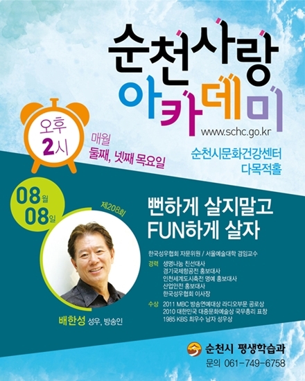 [천지일보=김미정 기자] 순천시는 오는 8일 문화건강센터 다목적홀에서 국민 성우 배한성 씨를 초대, ‘제208회 순천사랑 아카데미 강연’을 한다고 전했다.