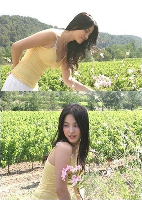 사진 속 송혜교는 노란색 민소매 티를 입고 풀밭에서 꽃의 향기를 맡으며 카메라를 응시하고 있다. 특히 송혜교의 트레이드마크인 글래머 몸매는 더욱 눈길이 끈다.