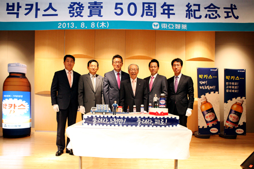동아제약은 8일 본사 대강당에서 강신호 동아쏘시오홀딩스 회장과 강정석 사장, 김원배 동아에스티 부회장, 신동욱 동아제약 사장 등 본사 및 계열사 대표와 임직원이 참석한 가운데 ‘박카스 발매 50주년 기념식’을 열었다.
