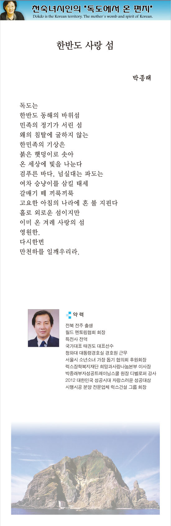 관련기사 [독도시] 소나무를 다시 품어라 - 김순영 [독도시] 독도에게 보내는 편지 - 김소해 [독도시] 또 하나의 미래 독도! - 최석주 [독도시] 역사를 왜곡한 죄 - 김석쇠 [독도시] 독도 아리랑 - 천기화 [독도시] 독도 - 이혜경 [독도시] 새말 휴게소에 독도가 있었다 - 장분선 [독도시] 내 아들 독도야 - 이영하 [독도시] 독도의 노래 - 임보선 [독도시] 독도여! 하늘의 새 창을 열라 - 전근표
