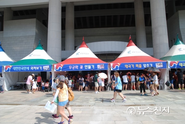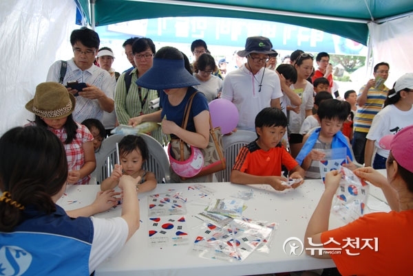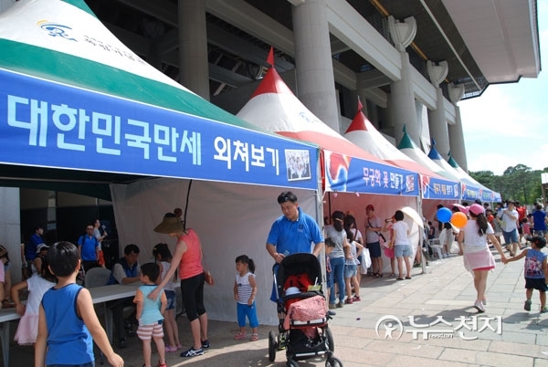 이날 35도의 폭염 속에서도 가족과 함께 독립기념관을 찾은 아이들이 대한민국 만세! 외쳐보기, 태극 바람개비 만들기, 태극 손도장 찍기, 무궁화 꽃 만들기, 태극퍼즐 맞추기, 페이스 페인팅, 우리 땅 독도에게 한 마디 리본달기, 나라사랑 사인스피닝 퍼포먼스 등 체험을 즐겼다.