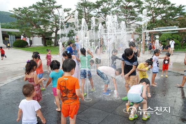 한편 ‘겨레의 집’ 뒷편에 있는 분수에 몰려든 아이들이 물장난을 하며 잠시나마 더위를 식혔다.