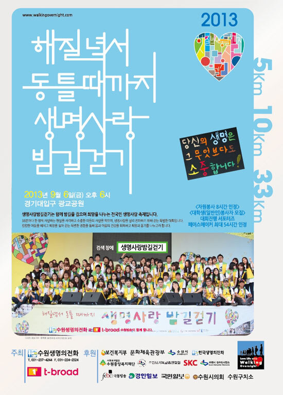 이번 ‘2013생명사랑 밤길걷기’ 행사의 참가접수는 오는 8월 31일까지 홈페이지(http://suwon.walkingovernight.com)를 통해 신청이 가능하다.