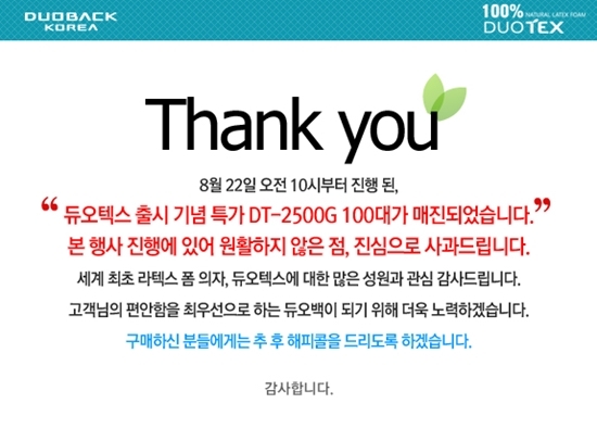 듀오백코리아는 10시께 긴급공지를 통해 “홈페이지 복구를 위해 최선을 다하고 있다”고 밝혔다. 이어 “선착순 100대가 모두 매진되었습니다. 본 행사 진행에 있어 원활하지 않은 점, 진심으로 사과드립니다”라는 말을 전했다.