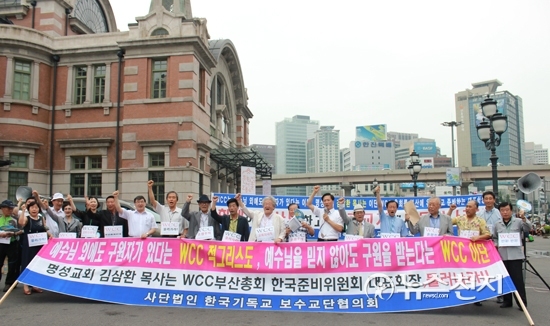 [천지일보=강수경 기자] 한국기독교보수교단협의회(한보협)가 23일 구 서울역사 앞 광장에서 WCC한국준비위원회(KHC) 상임위원장인 김삼환 목사 퇴진과 WCC부산총회 반대 구호를 외치며 시위를 벌였다.