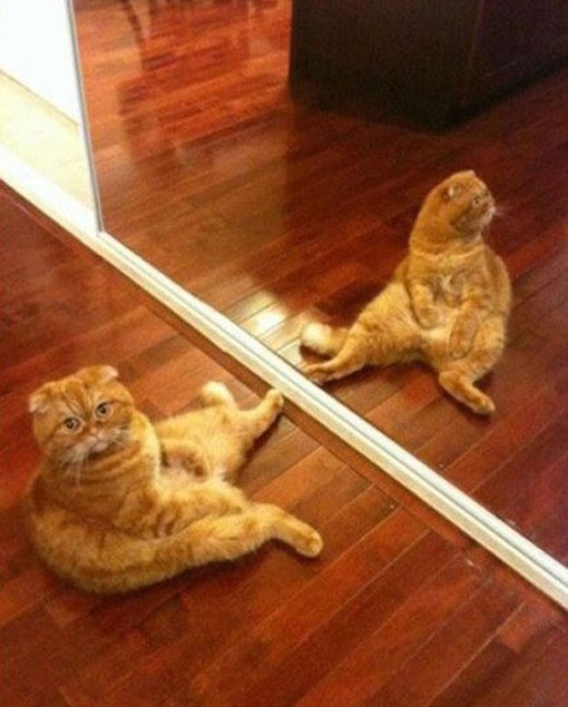공개된 사진에는 자신의 모습이 비취는 대형 거울 앞에서 한 고양이가 자산의 뚱뚱한 모습에 충격을 받아 멍하니 앉아있는 듯한 모습을 하고 있어 웃음을 자아낸다.