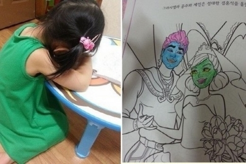 그런데 색칠공부 책에 그려진 왕자와 공주의 얼굴이 초록색이나 파란색 등으로 칠해져 있다.