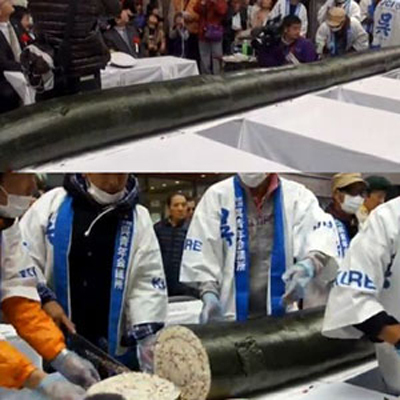 공개된 ‘초대형 김밥’은 일본 히로시마 주민들이 만든 것으로 길이 21m, 지름 31cm의 2000인분 김밥인 것으로 알려졌다.