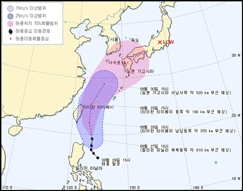 기상청에 따르면 지난 26일 필리핀 동남동쪽 약 460㎞ 부근 해상에서 발생한 콩레이가 현재 북상하고 있어 오는 주말쯤 제주도 남쪽 먼바다에 영향을 미칠 것으로 예상한다고 27일 밝혔다.