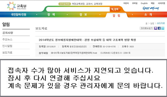 [천지일보=최유라 기자] 교육부 홈페이지가 접속자 폭주로 다운됐다.