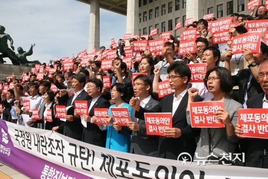 [천지일보=유영선 기자] 통합진보당이 2일 오전 국회 본청 계단에서 ‘국가정보원의 내란음모 조작 규탄 및 체포동의안 원포인트 본회의 반대’를 위한 전국지역위원장 긴급 기자회견을 열고 있다.