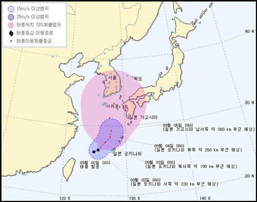 [천지일보=김예슬 기자] 제17호 태풍 도라지(TORAJI)가 주말께 국내에 영향을 줄 가능성이 있다.
