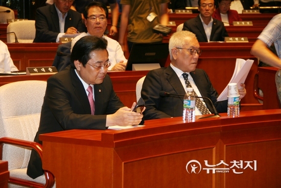 [천지일보=유영선 기자] 민주당 김한길 대표와 전병헌 원내대표가 4일 오전 국회 예결위회의장에서 열린 의총을 비공개로 전환하면서 고심하는 듯한 표정으로 자리에 앉아 있다.