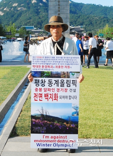[천지일보=장수경 기자] 4일 오후 서울시 종로구 광화문광장 이순신 동상 앞에서 환경운동가인 최병학(53) 씨가 “평창 동계올림픽 중봉 알파인 경기장 건설을 전면 백지화 해야 한다”고 주장했다.
