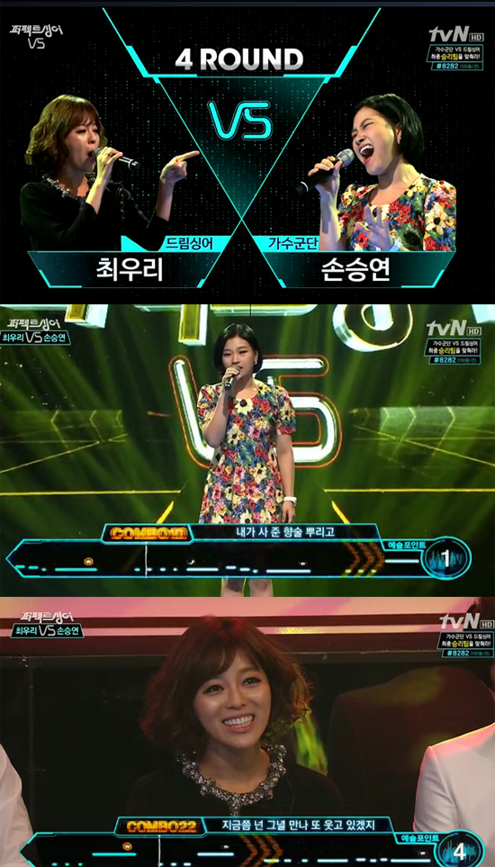 6일 방송된 tvN ‘퍼펙트싱어VS’ 4라운드에서는 가수 손승연과 뮤지컬 배우 최우리가 에일리의 ‘보여줄게’로 대결을 펼쳤다.