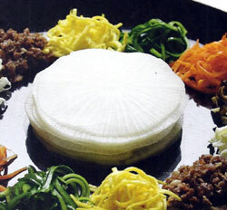 [재료] 무 1/3개, 표고버섯 3개, 장(간장 1큰술, 설탕1/2큰술, 참기름 1/2작은술, 다진파, 다진마늘 1/2작은술씩, 후춧가루 약간), 오이 1/2개, 당근 1/3개, 숙주 100g, 죽순 2쪽, 계란 1개, 소금, 참기름 약간 씩, 식용유 적당량, 촛물(식초 6큰술, 설탕 3큰술, 소금 1작은술), 겨자소스(연겨자 2큰술, 식초 2큰술, 설탕 1큰술, 배즙 1큰술, 간장 1/2작은술, 소금약간)