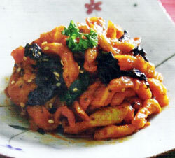 3. 무치기 : 잘 말려 놓은 무말랭이와 풋고추 잎을 찬물에 불려 물기를 꼭 짠 다음 만들어 놓은 양념간장에 잘 버무려 무친다.
