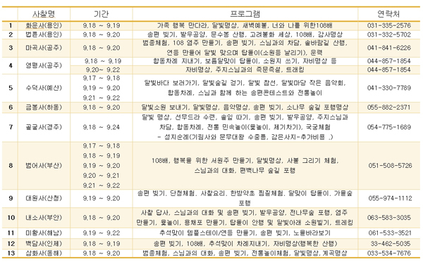 이밖에 경남 산청 대원사에서는 송편 빚기와 단청그리기, 달맞이 탑돌이, 가을 숲 포행을 비롯해 한방약초찜질 체험 등으로 구성된 ‘지리산 가을 숲, 달빛 템플스테이’를 진행할 계획이다.