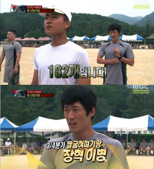 그 중 장혁은 2분 동안 182회라는 기록을 깨 기존 왕좌를 바꿨다. 장혁이 당당히 새로운 팔굽혀펴기왕으로 올라서자 부대원들도 뜨겁게 환호를 하며 축하를 보냈다.