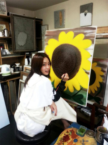 공개된 사진 속 강예원은 유화로 그린 해바라기 그림 앞에서 카메라를 응시하고 있다. 특히 잘 그려진 해바리기가 눈기을 끈다.