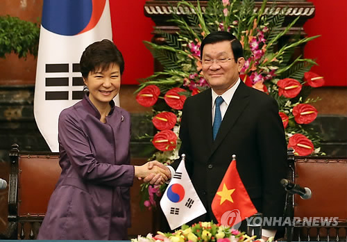 베트남을 방문 중인 박근혜 대통령은 9일 수도 하노이의 주석궁에서 쯔엉 떤 상 국가주석과 정상회담을 통해 이 같은 내용을 골자로 한 정상 공동성명을 채택했다고 청와대는 밝혔다.