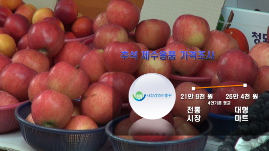 중소기업청 산하 시장경영진흥원에 따르면 전통시장 36곳과 인근 대형마트 36곳을 대상으로 추석 제수용품 27개 품목에 대한 가격조사를 실시한 결과, 전통시장에서 구입한 추석 차례상 비용이 21만 9천여 원으로 대형마트보다 4만 5천 원 정도 싼 것으로 확인됐습니다.