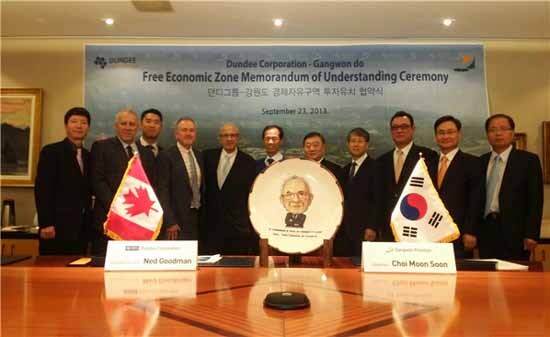 [천지일보 강원=김성규 기자] 강원도(도지사 최문순)는 지난 23일 세계적인 투자회사 캐나다 던디그룹(Dundee Corporation)을 방문해 캐나다 네드굿맨 회장과 동해안권 경제자유구역 개발사업에 참여하는 투자 유치합의서 ‘2014년 중 실시 계획 수립’ 등을 체결했다고 밝혔다.