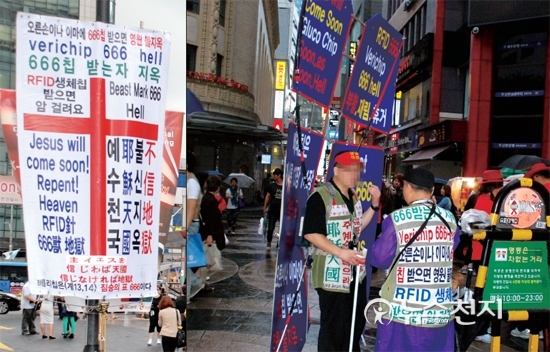이날 등에 홍보물을 짊어지고 나와 ‘예수천국 불신지옥’을 외치는 한 일행을 만날 수 있었다. 이들은 몸 앞쪽에는 ‘예수천국 불신지옥’ ‘주 예수를 믿으라’, 등 쪽에는 ‘666 받는 자 지옥’ ‘오른 손이나 이마에 666칩 받으면 영원불지옥’ ‘RFID 생체칩 받으면 암 걸려요’ 등 문구를 쓴 조끼를 입고 있었다.