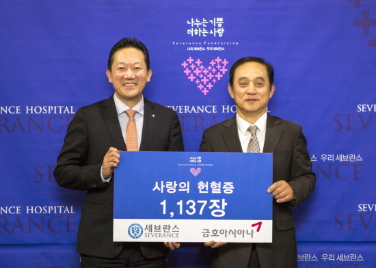 금호아시아나는 서울 서대문구 신촌동에 위치한 연세대학교 세브란스병원에서 정남식 연세대학교 세브란스병원장 및 금호아시아나 관계자가 참석한 가운데 헌혈증 기증식을 가졌다.