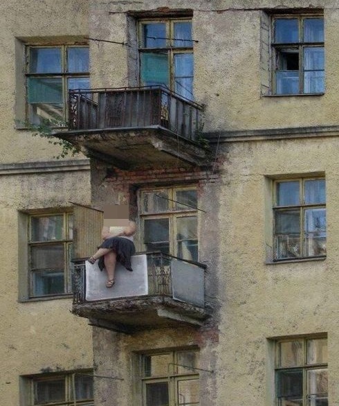 공개된 사진에는 곧 무너져 내릴 것 같은 낡은 건물의 모습이 찍혀있다. 그런데 몸집이 큰 여성이 이 건물의 베란다 난간에 걸터앉아 여유를 부리고 있어 눈길을 끌고 있다.