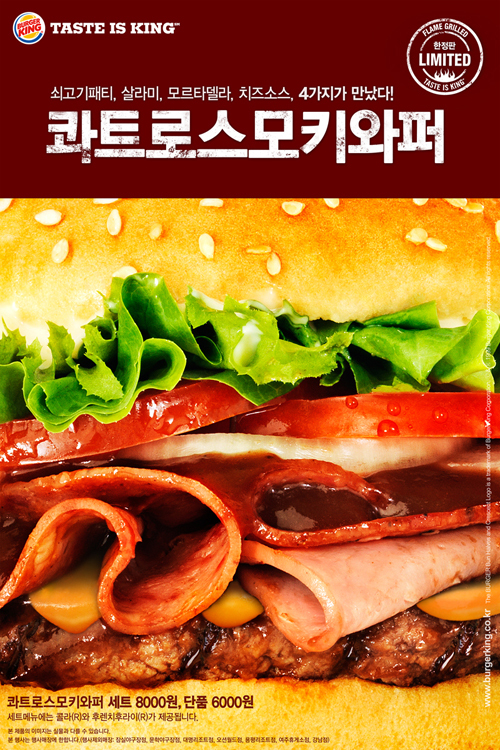 버거킹이 출시한 가을 한정메뉴 ‘콰트로스모키와퍼’는 매콤하고 쫄깃한 이태리식 살라미와 이국적인 맛을 풍기는 모르타델라, 100% 순쇠고기 패티, 고소하고 부드러운 체다 치즈 크림이 어우러져 기존 와퍼와는 색다른 맛이 특징이다.