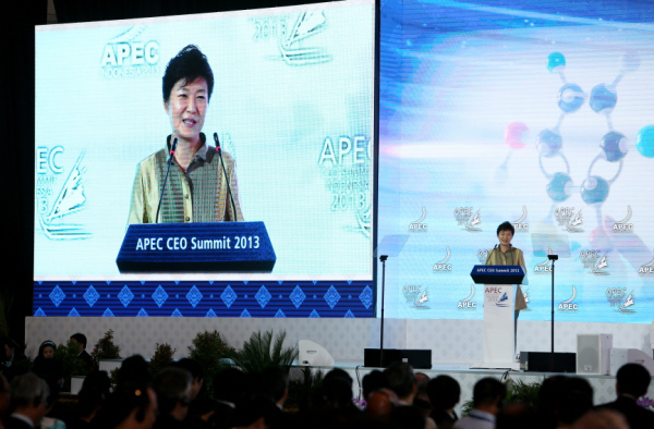 [천지일보=명승일 기자] APEC 정상회의에 참석 중인 박근혜 대통령이 6일(현지시각) 발리 BICC에서 열린 CEO 서밋 세션 6에서 창조경제를 강조하는 기조연설을 하고 있다. (사진제공: 청와대)