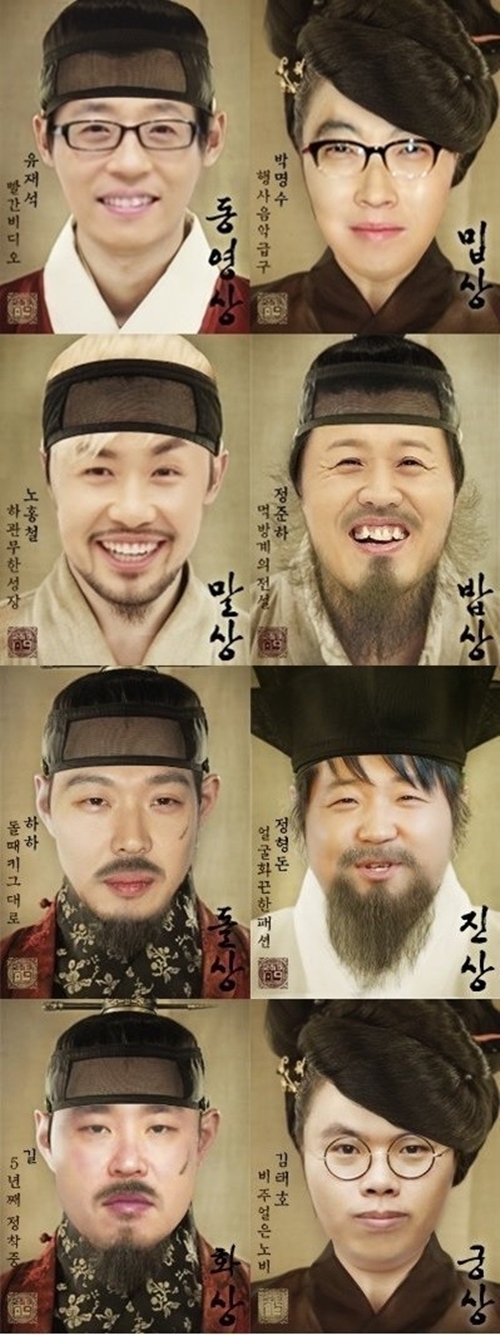 각 멤버의 설명이 더 압권이다. 유재석은 ‘동영상’ 빨간 비디오, 박명수는 행사음악 급구 ‘밉상’, 노총철은 하관 무한성장 ‘말상’, 정준하는 먹방계의 전설 ‘밥상’, 하하는 돌 때 키 그대로 ‘돌상’, 정형돈은 얼굴 화끈한 패션 ‘진상’, 길이는 5년째 정착 중 ‘화상’, 김태호 PD는 비주얼은 노비 ‘궁상’이라고 설명하고 있어 폭소를 자아내고 있다.